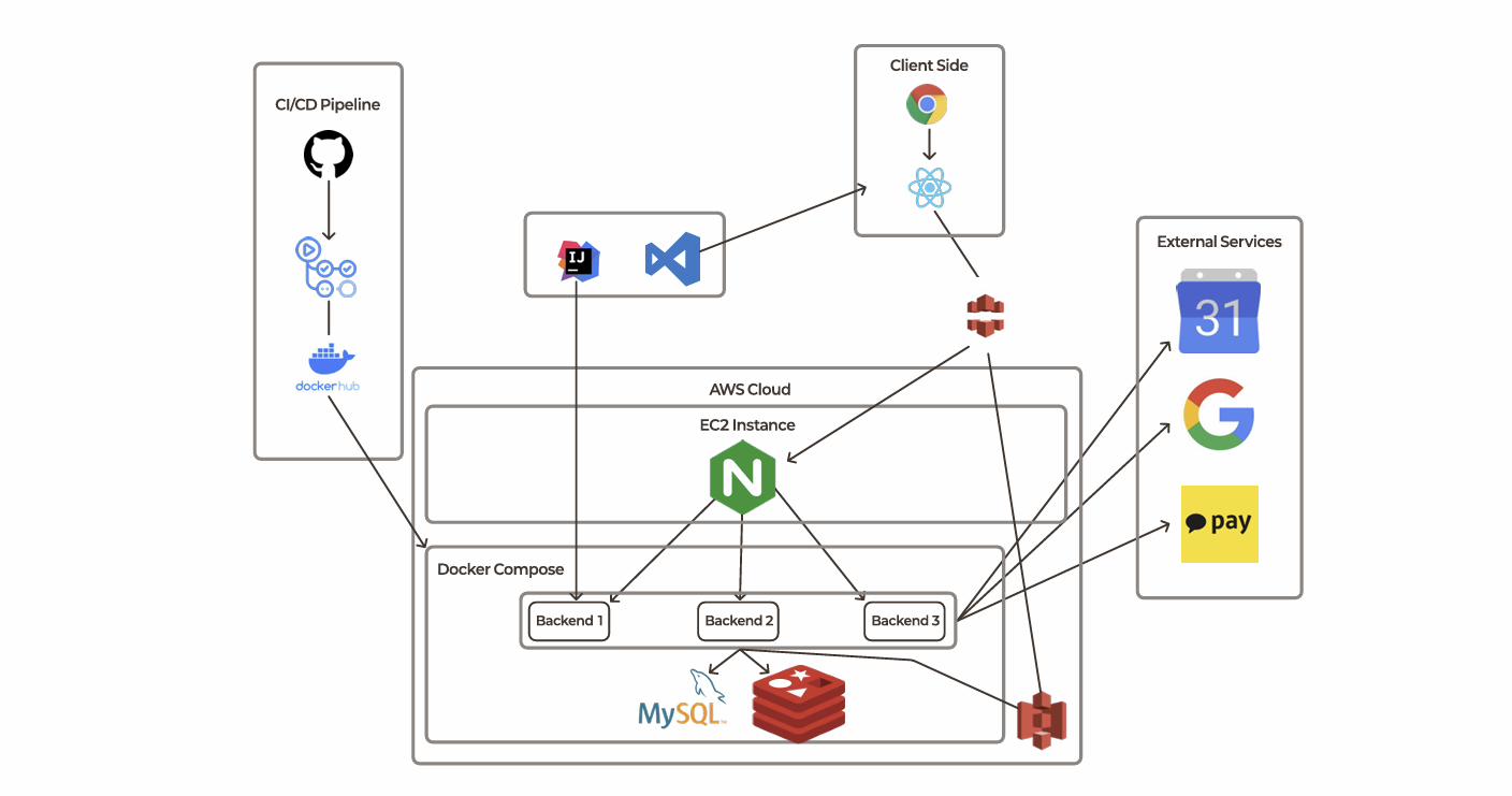 우리 서비스의 최종 시스템 아키텍쳐이다. Nginx 로드 밸런싱을 적용하여 서버 컨테이너를 3대 두어 트래픽 관리를 하였고, Cloudfront CDN을 적용하여 성능을 향상시켰고 로딩 시간을 단축했다. 그 외에 Docker compose, Github Action CI/CD를 적용하여 배포 및 버전 관리의 간편화도 신경 썼다! 내 입장에서 이번 해커톤의 하이라이트라고 생각되는 부분이 바로 이러한 다양한 기술적 시도를 많이 해본 것이었다! 처음 기획조건으로 받은 구글 소셜 로그인 구현과 카카오페이 및 구글 미트 api 호출 기능부터 시작해서 Redis, 로드밸런싱 Docker Compose 및 CI/CD까지 새롭게 해본 것들이 정말 많았고, 결과적으로 이것들을 통해 기술 1등 상까지 받았으니 내 입장에서는 두 마리 토끼를 다 잡았다고 할 수 있었다 ㅎㅎ