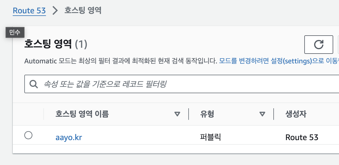 Route 53은 클라우드 도메인 이름 시스템(DNS) 서비스이다. 이게 없으면 사이트에 'www.naver.com' 같은 도메인 이름이 아니라, 숫자로 되어 있는 IP 주소로 들어가야 한다. 또 이게 없으면 http를 https로 바꾸는 것도 못한다고 한다. 근데 생각해보니까 우리는 도메인을 구매해서 거기에 연결했지 않은가? 생각해보니까 우리 팀장님이 나한테 도메인 등록해야된다고 AWS 아이디를 받아간 적이 있었는데 그게 이유였다. 확인차 Route53 탭에 들어가 본 결과...