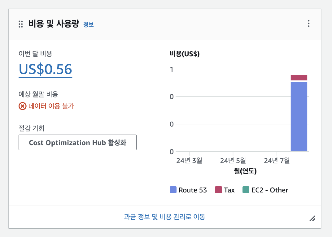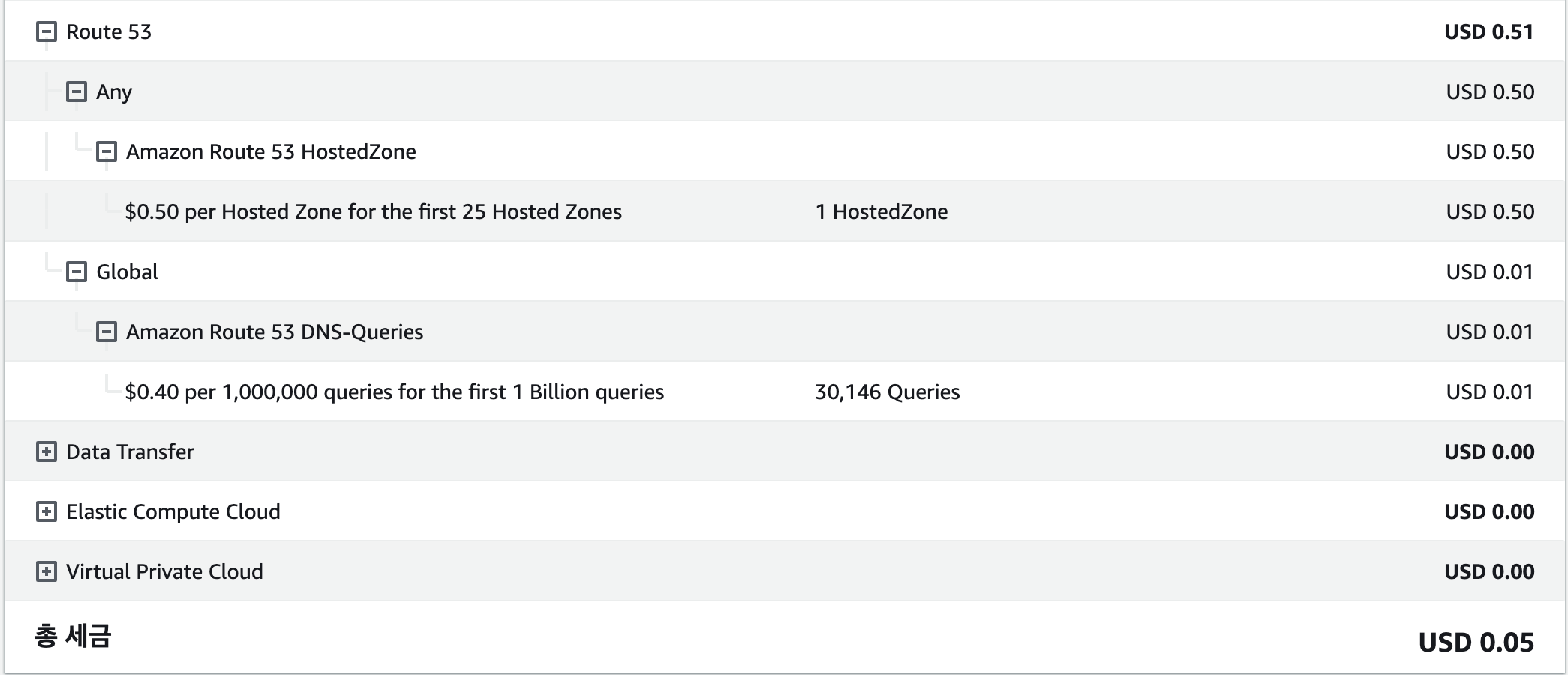 AWS가 제공하는 Route53 서비스에 대한 이용 요금이 청구된 것이었고, 이 부분이 프리 티어에는 포함되어 있지 않아서 발생한 요금이었다~~